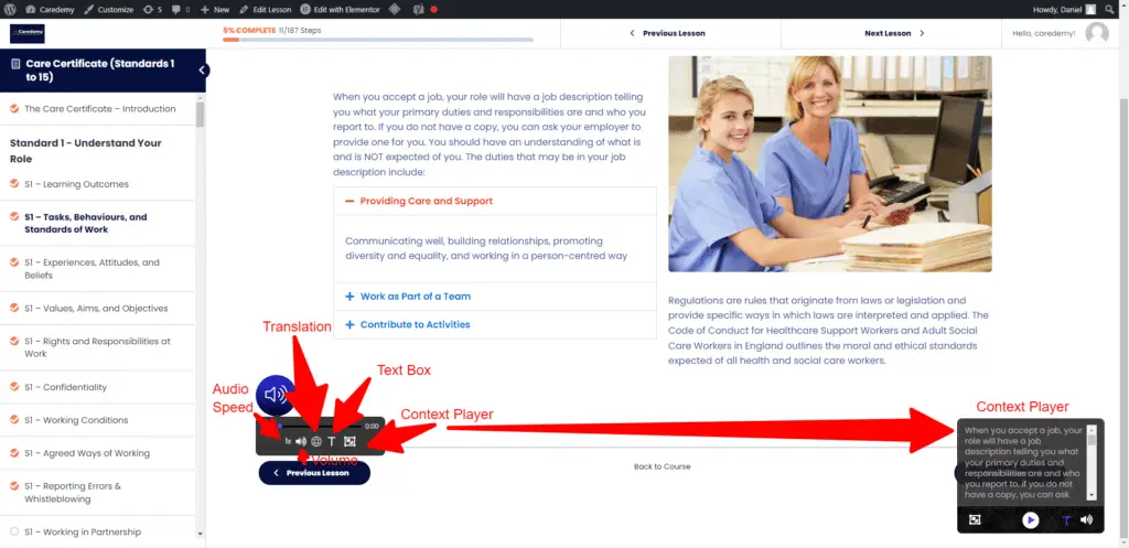 The context player opens a box to the right side of the page, opening up a text box to help follow the course audio along with