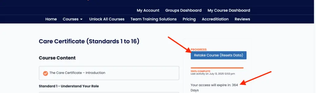 If you access the retake course option, the course progress will be reset. This means the course should be completed again for the certificate to be issued.